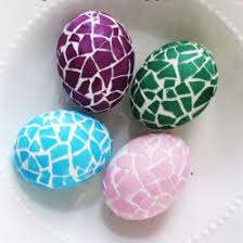 Πρώτα βράστε τα αυγά,ώστε να μπορέσετε να τα φάτε και αρχίστε να τα σπάτε χτυπώντας τα σε ένα σκληρό αντικείμενο προσέχοντας να μην σπάσουν ολόκληρα.Αφαιρέστε μικρά κομματάκια από τα ραγισμένα αυγά και αφού γεμίσετε ένα βαθύ μαγειρικό σκεύος ή ποτήρι,με νερό,προσθέστε χρώμα ζαχαροπλαστικής στο χρώμα της επιλογής σας.Ανακατέψτε το καλά και βουτήξτε μέσα τα αυγά.Στη συνέχεια,βάλτε τα στο ψυγείο για 5 ώρες και μετά μπορείτε να τα βγάλετε από το σκεύος.Τέλος,"καθαρίστε" τα ολόκληρα και κάποια από τα μικρά κομματάκια που είχατε αφαιρέσει πριν,θα φαίνονται άσπρα.